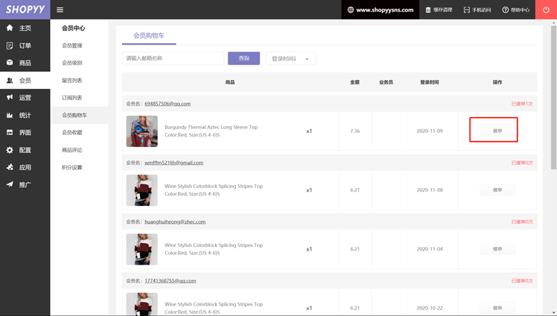 网站单量不是特别大的情况下,观察注册买家的购物车,点击催单可以发送优惠券码促进交易。