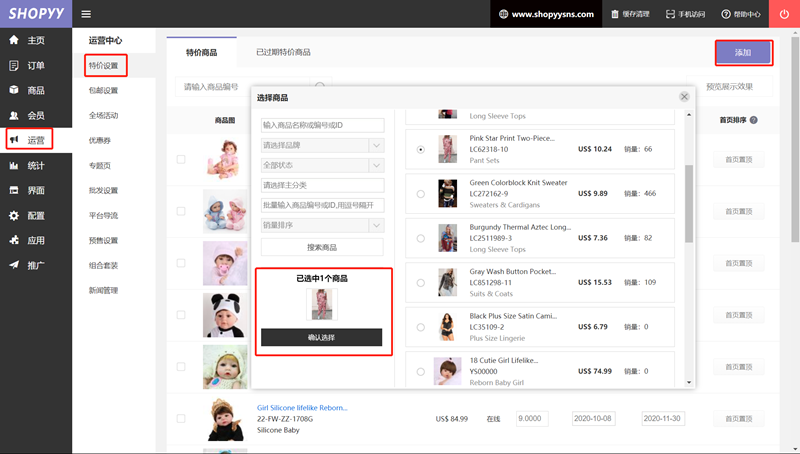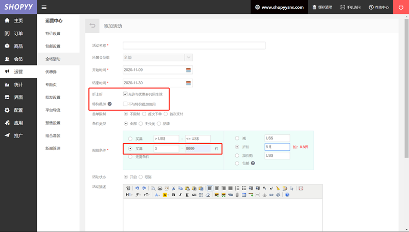 SHOPYY后台商城搜索特价,可多个产品批量设置折扣。