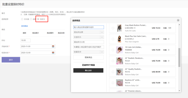 我们可以根据:主分类,品牌或者是自定义某些产品一起特价,如图
