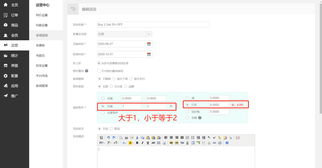 买两件打95折,属于购物车达到2件商品,自动触发事件,用全场活动做。
