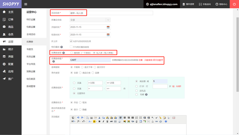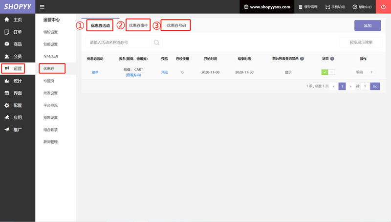 位置:运营——优惠券——分别是优惠券活动、优惠券时间和优惠券号码。