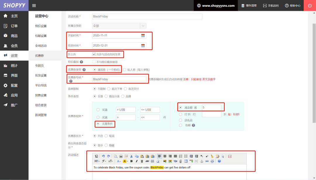 企业主设置了通用券,券码:AWM01,输入这个码-$5,那我们需要途径告诉买家这个活动和码。