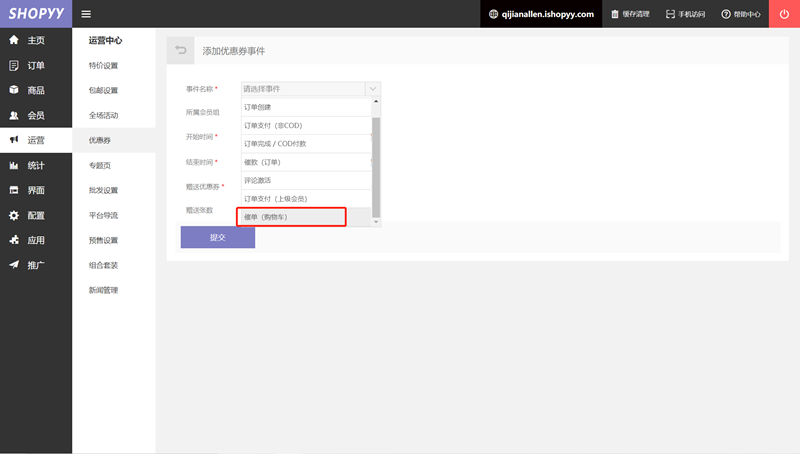 配置完成,剩下的只需要在会员-购物车-催单,即可发送私人优惠券。