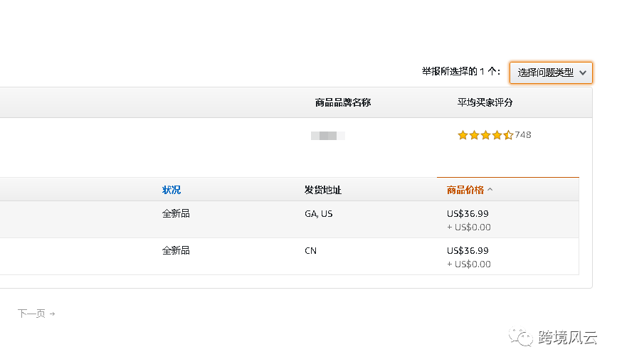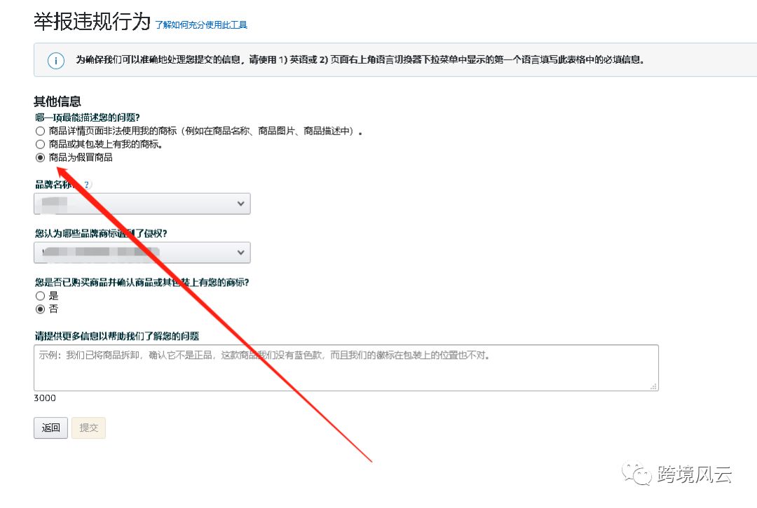 接着选择你的品牌,是否已购买该商品选择否。选是亚马逊需要你提供订单编号等,这里我们是使用不购买就投诉的方式,降低我们投诉的成本和麻烦。