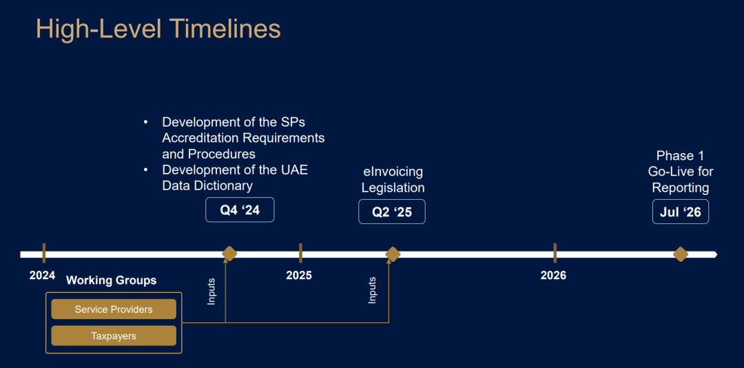 阿联酋政府将从2026年第二季度开始逐步为企业推出电子发票实施,让企业有时间准备其系统和流程。具体的合规期限和过渡时间表将在适当时候公布。