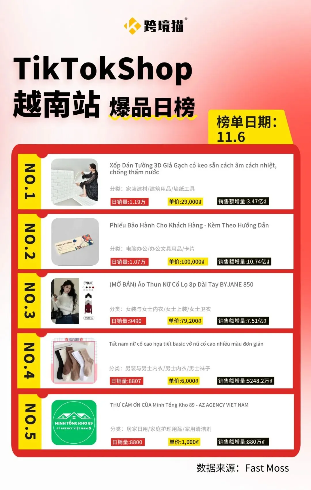 在越南站,家装建材类产品表现突出,排名第一的3D墙纸日销量达1.19万单,销售额超8亿越南盾,反映了家庭装修和实用需求的增长。同时,办公文具和女装卫衣也进入前三,显示越南用户对工作和生活用品的多样化需求。