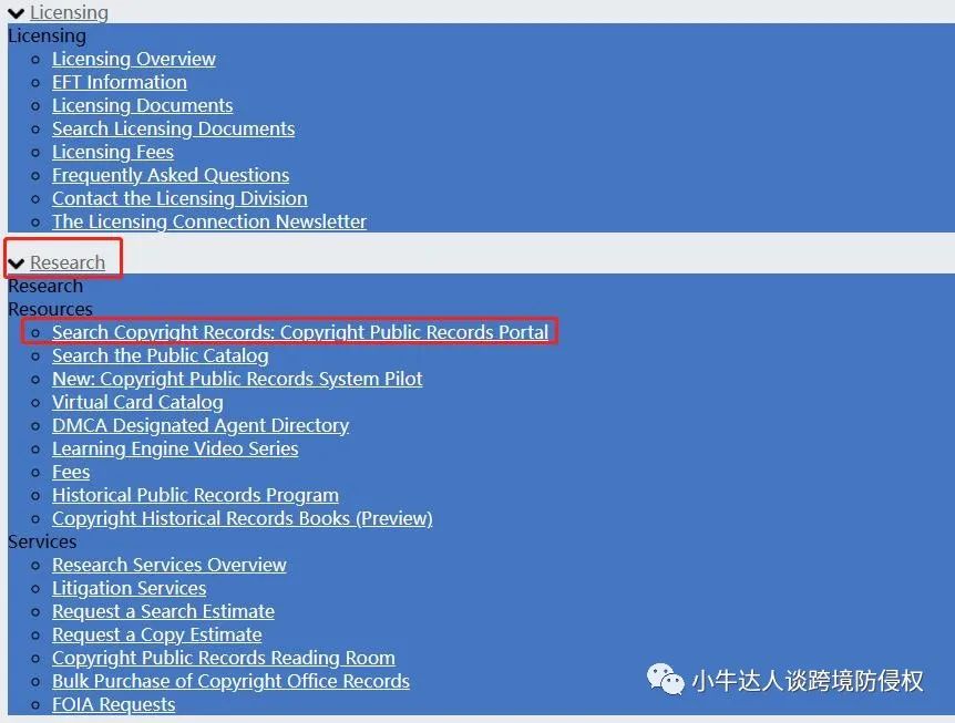 下滑找到“Research”板块,点击“Search Copyright Records: Copyright Public Records Portal”