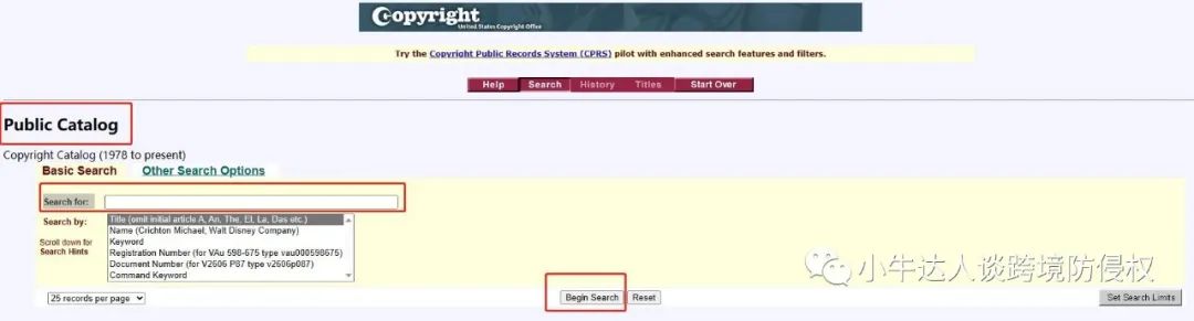在“Public Catalog”板块中的“Search for”中输入“作品标题、持有人姓名、关键词、注册号、文件编号”,点击“Begin Search”;