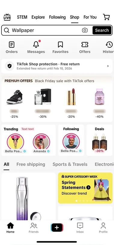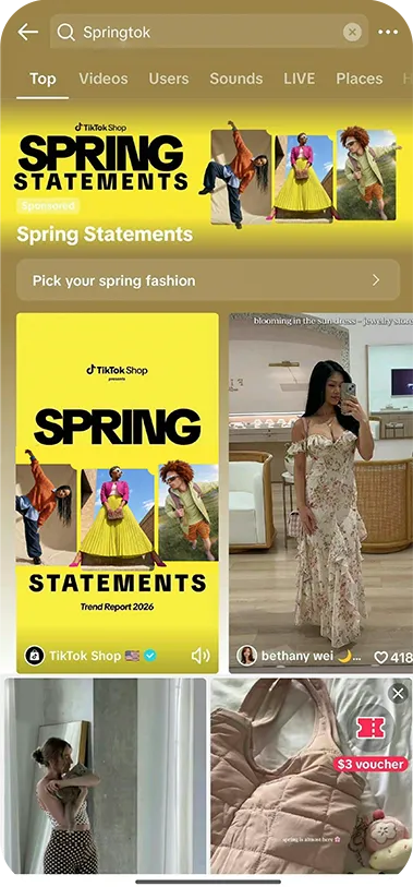 打造春日种草转化阵地:本次活动采用高饱和度亮黄色为主色调,凸显春日氛围感,不仅打造了主会场 H5 页面,还打通 Branded Search Hub、话题页及商城 Feed Banner 等流量入口,串联起内容种草到电商转化的完整路径。
