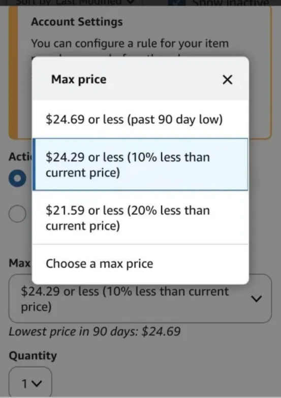 价格只要跌到≤自己设定的最高价,系统直接自动下单、自动扣款,不用再二次确认,直接成交。比如一款商品现在卖20美元,你把目标价设15美元,一旦标价降到15美元,系统立马生成订单,从默认付款方式扣钱,送到默认收货地址,全程不用动手。