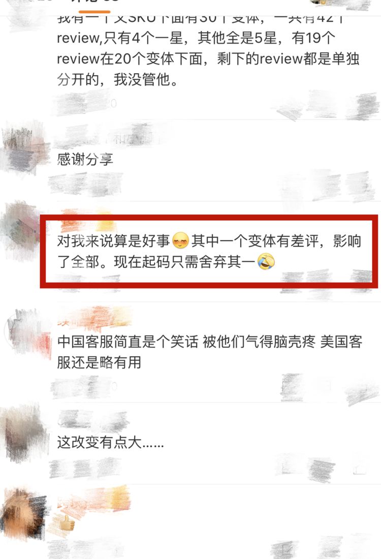 一位卖家在6月末的时候发现一条变体6个产品,2老4新,新品和差评多的一个老品共享review,那个好评多评分高的老品却独立显示,她非常不服气,于是开case了解具体情况,中国客服给的答复是类目全都一致,但是review他们也无能为力。