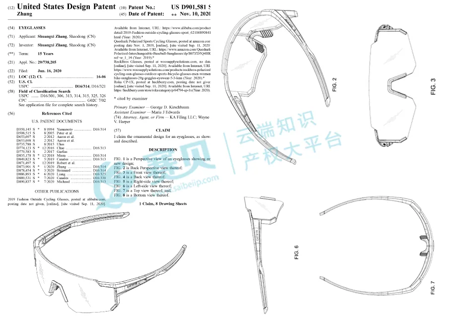 这次维权的是美国外观专利 US D901,581 S。这款专利早在2020年6月16日就提交申请,2020年11月10日正式授权,专利名称就是 “Eyeglasses / 眼镜”,保护的是镜框轮廓、镜腿线条、整体比例以及关键连接部位的装饰性设计。大家一定要记住,美国外观专利判定的核心是 “整体视觉印象”,不是说你改改颜色、换个小细节就没事了,哪怕只是借鉴了专利里的核心轮廓,只要消费者看你的产品和专利设计整体观感相似,就有可能构成侵权!