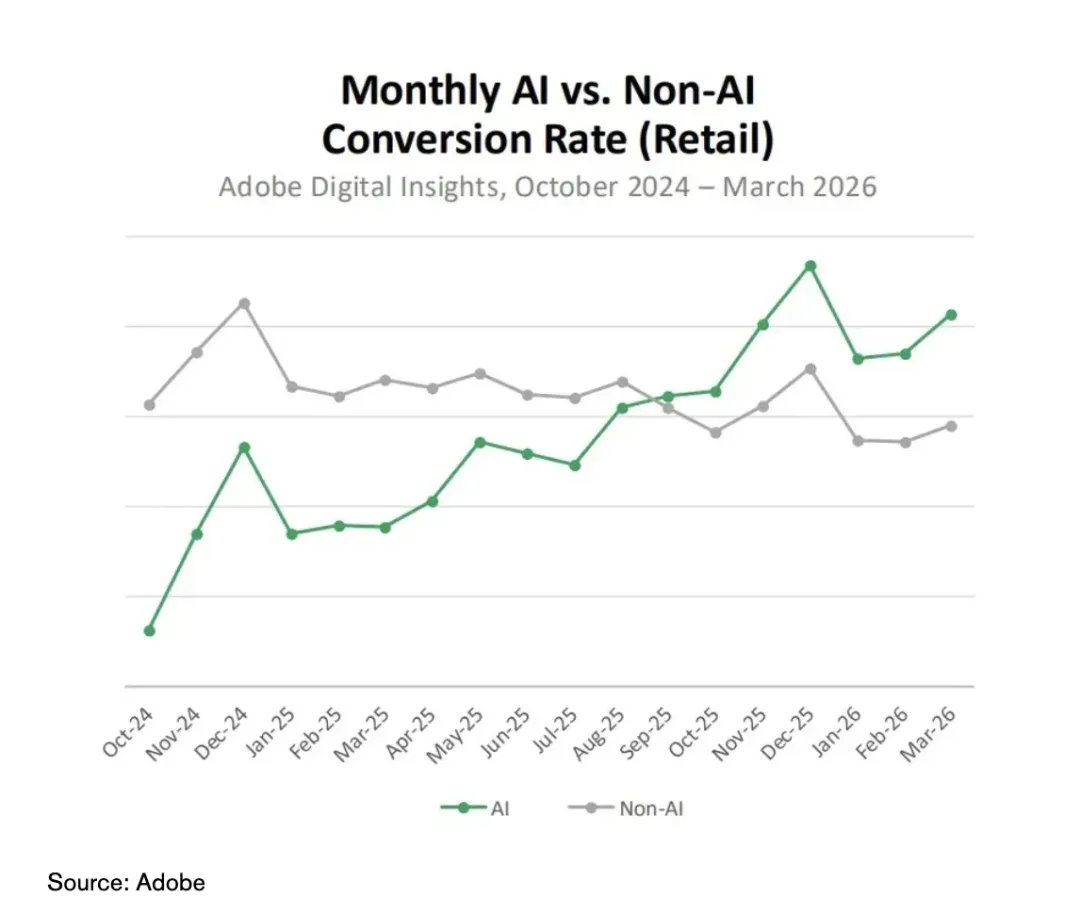 2026年3月,AI带来的流量转化率高出传统渠道42%,创下新高。同时,AI带来的单次访问收入比非AI流量高出37%。在一年前,普通用户流量的价值还比AI流量高出128%。通过AI助手进入电商网站的用户,页面停留时间增加48%,每次访问浏览页面数量增加13%,整体互动率提升12%。