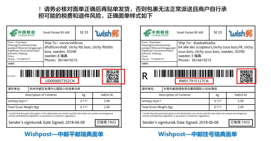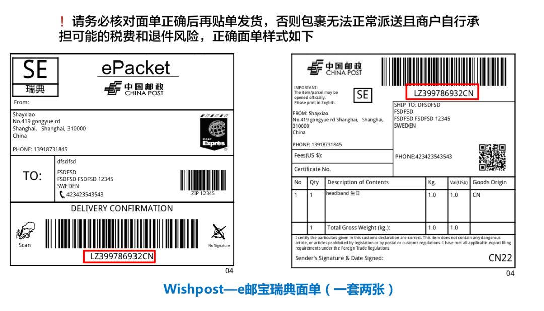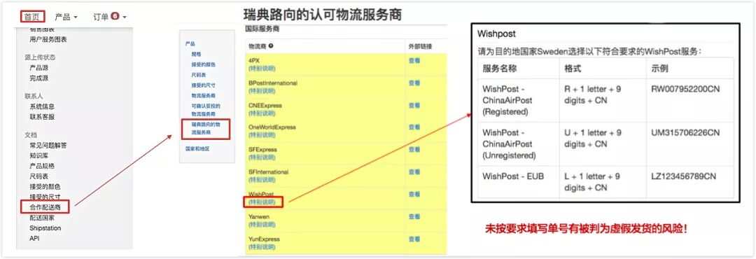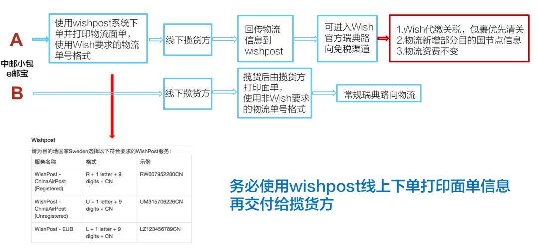 瑞典市场正在蓬勃发展 履行瑞典路向订单,利好多多 W教授要告诉大家:瑞典路向的订单不!考!核!妥投率!并且还!有!返利! ① 2018年4月19日起,瑞典路向的订单不考核妥投率。 ② 2018年3月26日后生成的瑞典路向达标订单,可获得3%的返利奖励:订单必须在2018年4月25日后由物流服务商确认妥投,且满足确认妥投政策和履行订单政策5.5(订单需在生成后7天内由物流服务商确认履行),方可获得返利。返利计算公式为:3% × 订单数量 ×(商户所设产品价格 + 商户所设产品运费)。 所以对商户而言,瑞典路向的订单履行要求比其他路向更加宽松友好。 选择正确物流渠道是关键 想要顺利履行瑞典路向订单,避免因为“误操作”而被罚款的关键在于选择正确的物流渠道。所以W教授建议大家: ① 使用Wish合作的物流渠道 ② 正确填写物流单号格式 瑞典订单,必须选择这些物流商! 为确保订单满足有效跟踪及妥投的要求,对于目的国为瑞典的Wish Express订单需使用合格的物流服务商名单中的服务商进行配送。而对于6月4日0时(世界时间)及之后被标记为“已配送”的所有目的国为瑞典的非Wish Express订单,商户需要选择以下几个物流服务商履行订单。 商户必须选择以下瑞典路向的认可物流服务商履行瑞典路向订单: ①4PX ②BPostInternational ③CNEExpress ④DPD ⑤GLS ⑥OneWorldExpress ⑦SFExpress ⑧SFInternational ⑨WishPost ⑩Yanwen ⑪YunExpress 注: 1.当商户选择该瑞典路向物流服务商来履行订单时,需要提供特定的物流跟踪单号格式。查询单号格式请看下文教程。 2.使用WishPost(WishPost-中国邮政小包,WishPost-E邮宝)履行瑞典路向订单需登录Wish邮官方网站(www.wishpost.wish.com)进行相关发货操作。 3.瑞典路向的认可物流服务商名单实时更新,请及时关注Wish商户平台。 瑞典订单,单号格式必须准确! 商户选择以上瑞典路向的认可物流服务商履行订单时,需要提供特定的物流单号,否则会被平台判断为虚假物流处理。 如何正确填写物流单号? 商户可通过点击商户后台左下角“合作配送商”——“瑞典路向的物流服务商”,即可看到“Wish合作的瑞典路向物流合作商列表”,点击服务商名称下方的“特别说明”,便可查看该服务商瑞典路向订单的特定物流单号格式。 如上图所示,商户选择WishPost-ChinAir Post(Registered)履行瑞典路向订单时,必须严格按照“R+1letter+9digits+CN”格式填写物流单号,否则可能需要承担退款责任,且有可能面临虚假物流罚款。 很多商家反映:我用的就是WishPost啊,为什么无法享受WishPost三大权益?甚至被用户取消订单? 如上图所示,商户A与B同样使用WishPost-中邮小包e邮宝履行瑞典路向订单,但商户B直接将货物交给揽货方发货(由揽货方打印面单,单号不符合特定格式),则该订单将被系统视为“常规瑞典路向物流”,无法享受WishPost瑞典路向三大权益,甚至产生极高的退款率以及有可能面临虚假物流罚款。 反观商户A先登录WishPost进行线上下单打印面单信息(面单所示单号符合特定格式),再将订单交给线下揽货方发货,则该面单信息将被WishPost抓取。那么该面单便可享受WishPost三大权益。 WishPost面单样式(可右滑) 拎重点 将Wish平台账户与WishPost账号进行绑定,并使用WishPost线上下单打印面单信息再交付给揽货方。 瑞典订单,Wish邮的正确使用姿势 从6月15日开始(以消费者下单时间为准),所有瑞典路向的订单,都可以使用WishPost-中邮小包或WishPost-e邮宝渠道进行发货啦~使用这两种渠道发货的包裹,可以享受三大特权! 1 Wish平台代缴关税,包裹享受优先清关 2 订单新增部分目的国节点信息 3 物流资费不变,依然优惠 使用WishPost-中邮小包或WishPost-e邮宝渠道发送瑞典路向的包裹,只需完成两项调整: ① Wish平台账户需与WishPost账号绑定 ② 完成绑定后,在申请WishPost-中邮小包瑞典路向和WishPost-e邮宝瑞典路向的面单时,提供正确的Wish订单ID(Order ID)