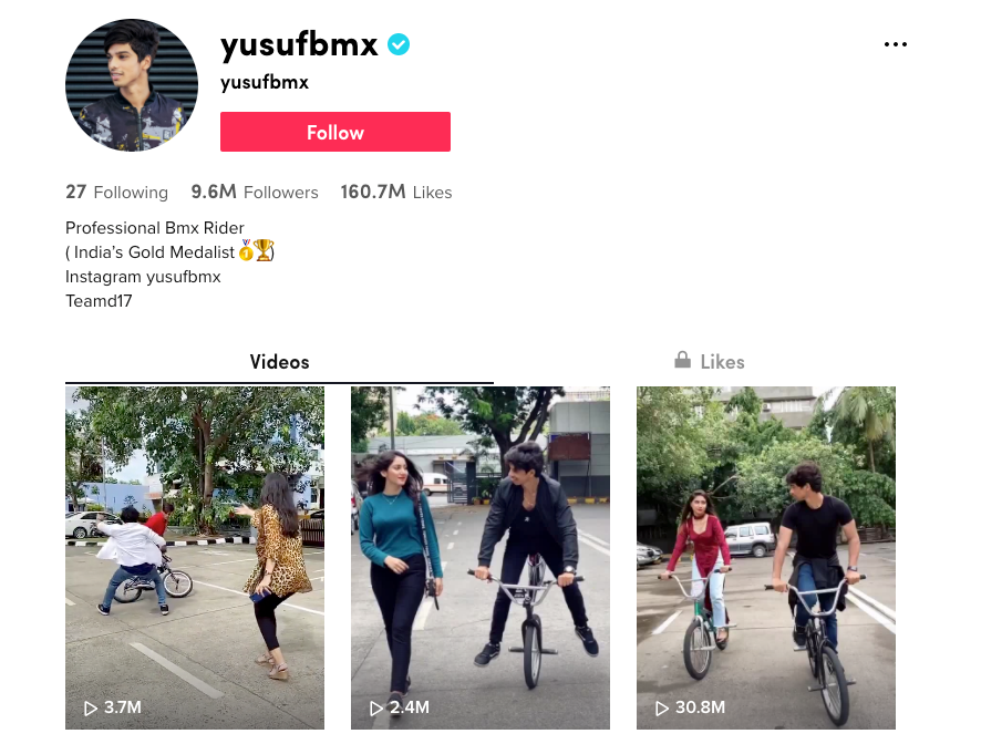 2.运动人们对各种运动都感兴趣,所以如果您有一个基于运动的帐户,请让人们很容易找到您并查看您的视频。BMX 自行车骑手@yusufbmx拥有经过优化的 简介。他分享自己的知名度——包括成为印度金牌得主——使用表情符号,并有一个指向他的 Instagram 的链接,人们可以在那里看到更多内容。