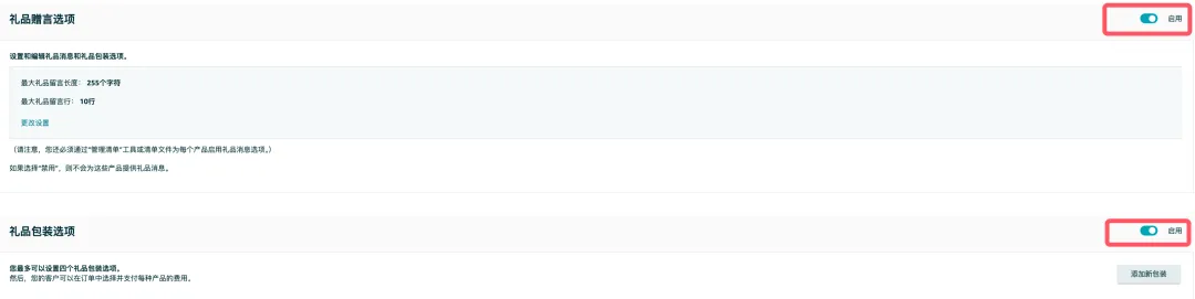 礼品选项(Gift Options)能让买家标注商品为礼品,包含 “礼品留言(Gift Messaging)” 和 “礼品包装(Gift wrap)” 两大功能。默认状态下这两项服务是关闭的,需要手动开启,尤其适合节日促销、生日礼物等场景,能显著提升买家下单意愿。