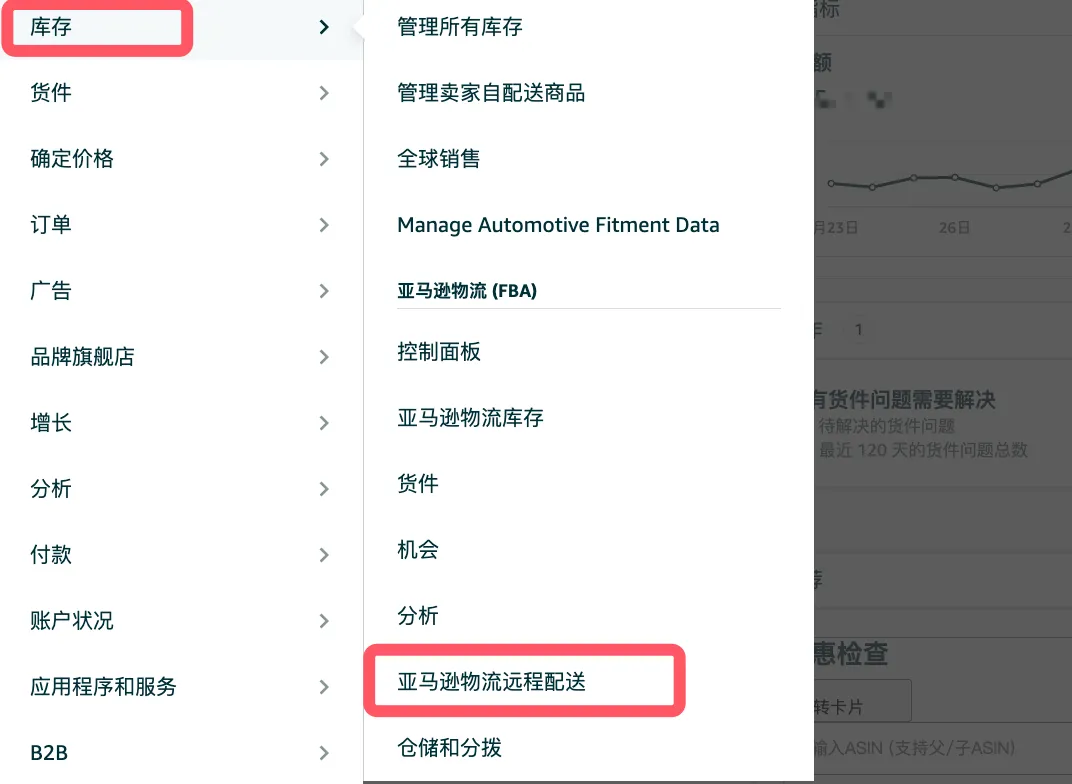 1. 登录卖家平台上的“库存”下拉菜单点击“亚马逊物流远程配送”。