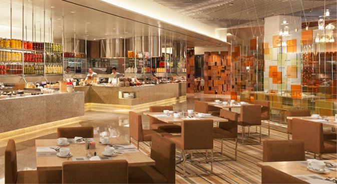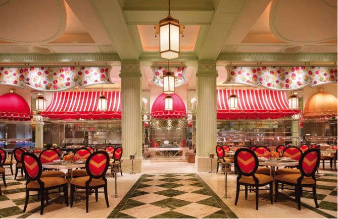 餐厅的装潢延续了酒店富丽堂皇的奢华风格,洒满阳光的中庭、红白条纹的华盖、花团锦簇的装饰,营造出了一个非常梦幻的就餐环境,自助菜品也比普通自助餐要精致一些。此外,餐厅有17个现场料理站,依照客人的喜好现做食物,绝对物有所值。