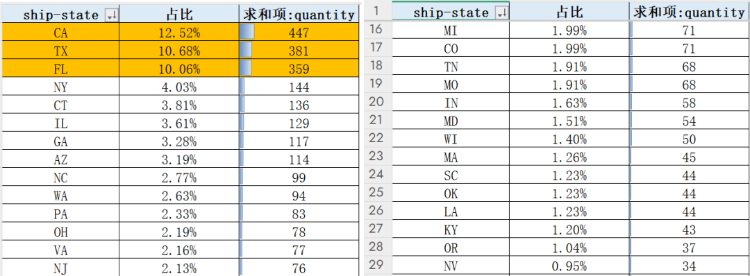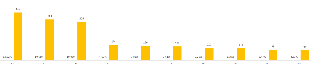 我们可以明显看到在加州、得克萨斯州、弗洛里达出单最多,我们可以用这3个州的邮编查询关键词排名, 另外补货重点往这3个州的仓库补。