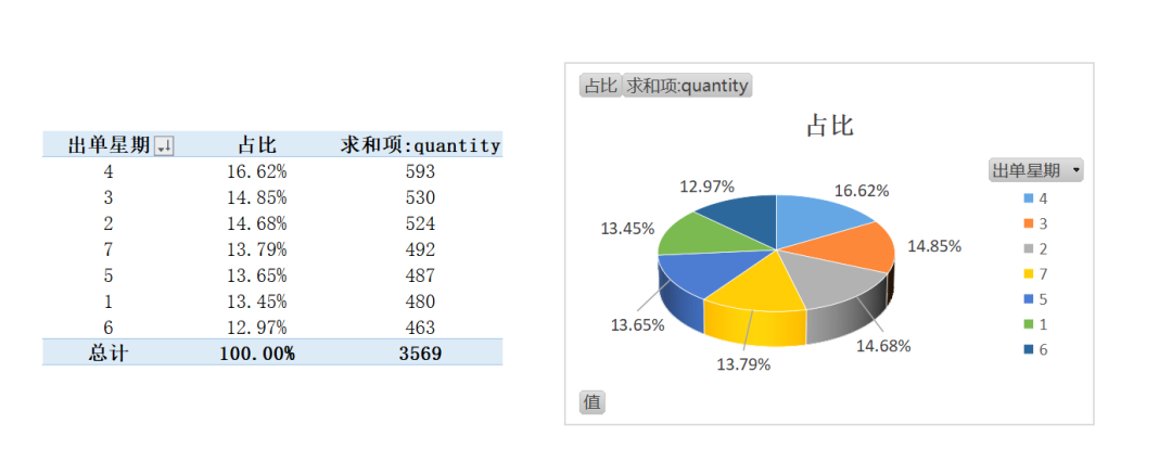 我们在原始表中可以根据出单日期,把日期用公式换算成周一到周日的日期,然后进行数据透视和可视化: