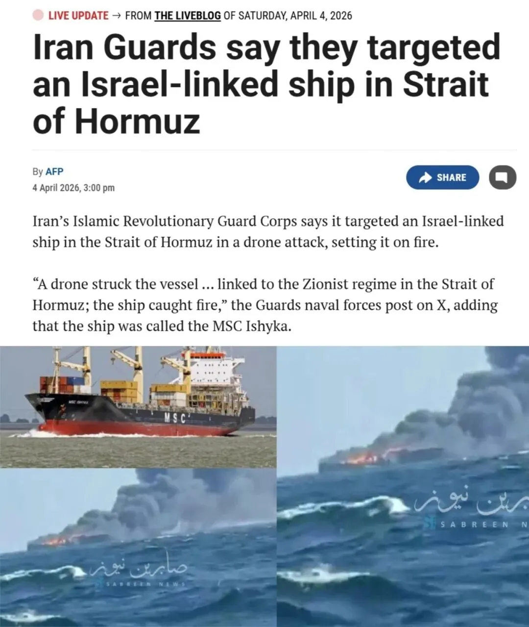 据伊朗伊斯兰革命卫队(IRGC)发布的消息,当地时间4月4日,其海军力量在霍尔木兹海峡对一艘被认定“与以色列存在关联”的集装箱船实施了无人机打击。伊朗国家媒体称,遭袭船舶为“MSC Ishyka”轮,袭击导致船体发生大范围火灾。