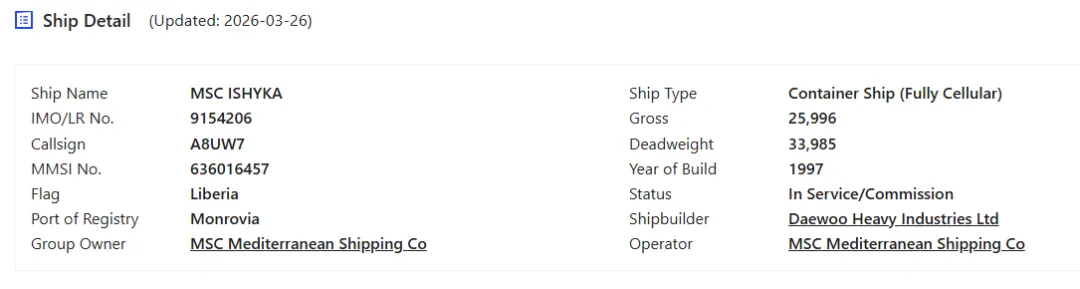 从船舶资料来看,“MSC Ishyka”轮是一艘悬挂利比里亚旗的支线集装箱船,建于1997年,船长约208米,运力约2500标箱(TEU),长期服务于MSC中东区域支线航线(Middle East Feeder航线)。该船主要在波斯湾及印度洋周边港口之间执行运输任务。