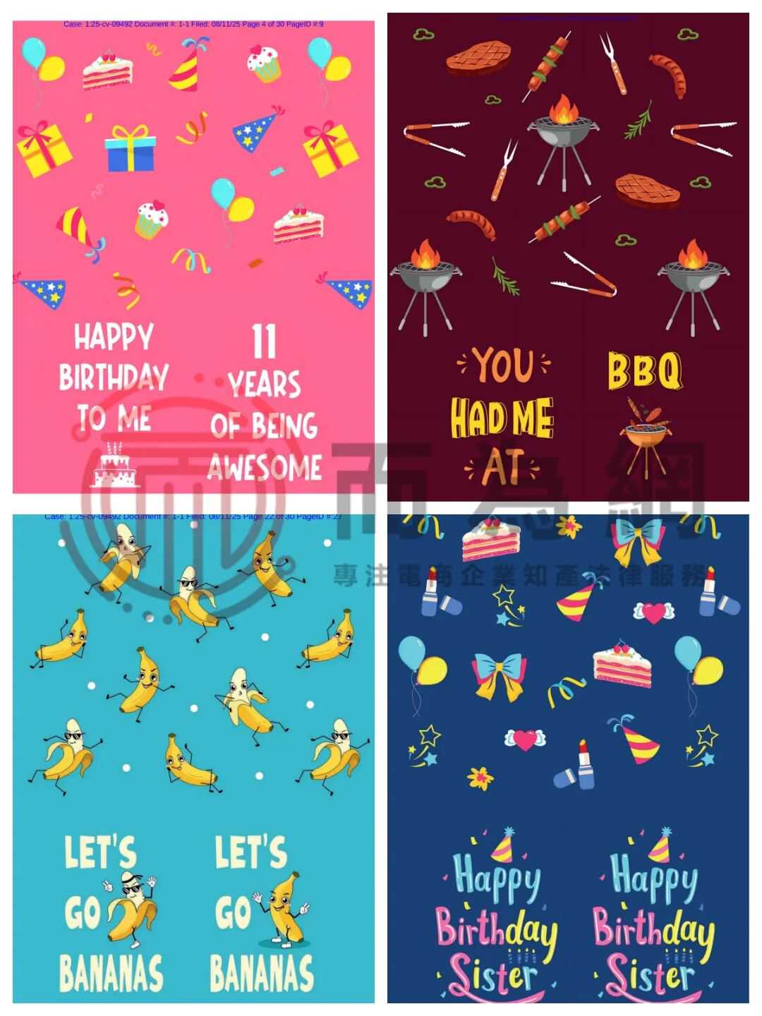 【侵权快讯】25-cv-9492 国人原告16张趣味图案版权发案维权!这些生日、动物、生活等元素图片有通通有风险!