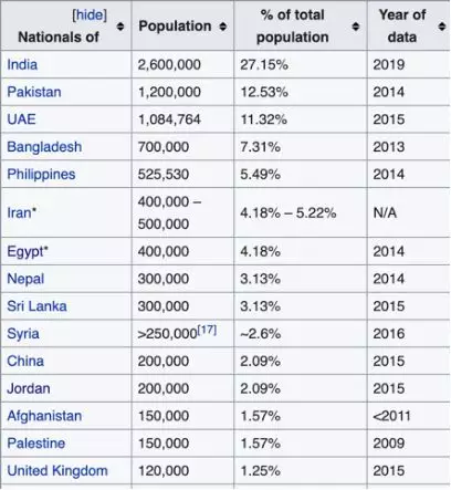 按照2018年统计,阿联酋总人口约为九百五十四万。和沙特相比,阿联酋的人口构成相对复杂:其中本地人口只占总人口数的11.48%,剩下的88.52%为来自世界各地的外来务工人员。外来人口中,印巴人占据59.4%,埃及人10.2%,菲律宾人6.1%,包括中国人在内的其它国家外来人口占据12.8%。