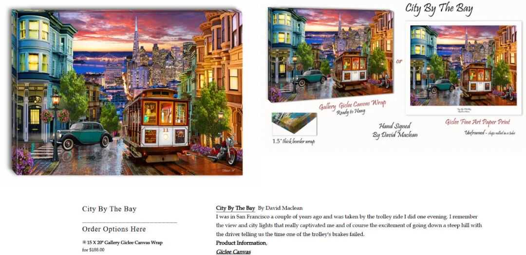 David的作品以鲜明的色彩描绘城市、海滨与田园景致,形成极具辨识度的视觉风格,迅速成为全球家居装饰的热门选择。他的大多数作品由伦敦顶尖艺术授权机构代理,作品遍布国际零售市场。