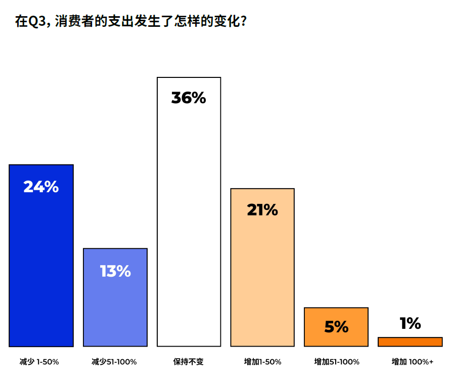 首先,消费者将继续削减开支,相比上个季度,73%的消费者表示,他们的开支将会在第三季度有所减少或持平,此比例在上个季度为76%,虽然略有回升但并不明显,可见消费者仍然对消费保持谨慎态度。