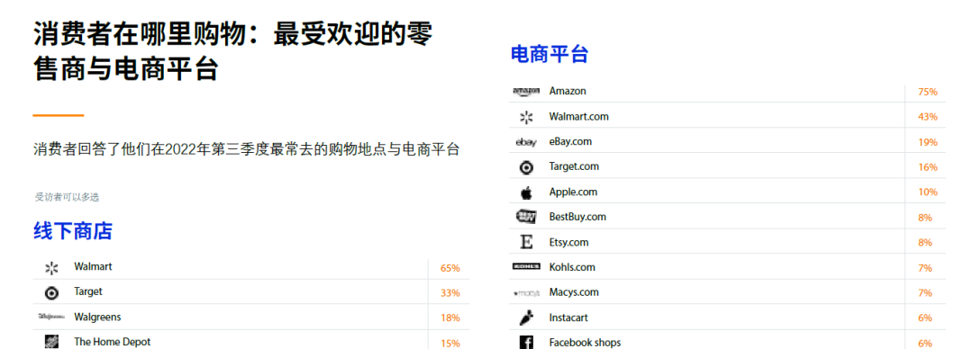 在购物地点方面,沃尔玛和亚马逊分别是消费者在线下与线上购物的首选,并且具有绝对的优势。