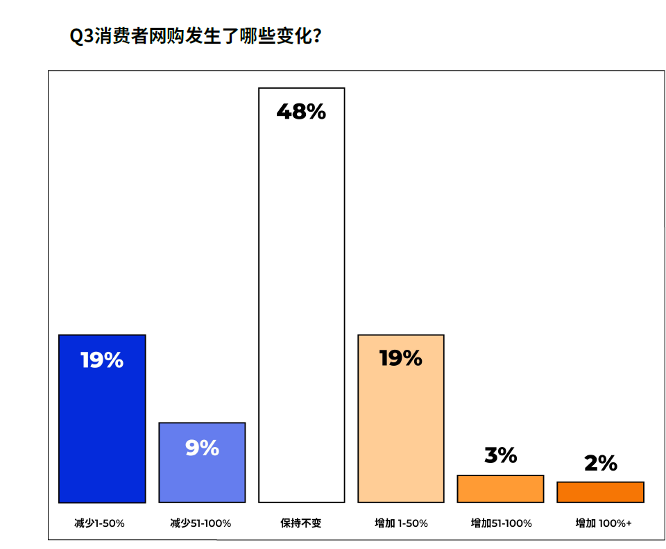 在线上,大多数消费者仍然表示他们的支出将减少或不变,但相比上个季度,表示支出将增加的百分比从24%增加到33%,这可能是因为亚马逊Prime Day是在7月进行的。