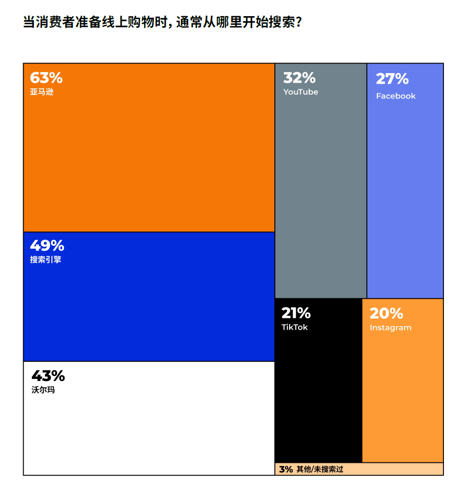 63%的消费者在想要网购时,都会首选亚马逊进行搜索,这一比例比上一季度略微提升(61%),其中Youtube、TikTok是增长最快的两个渠道,均增加10个百分点以上。