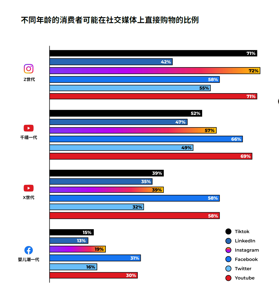 另外一个相当明显的趋势是,越来越的消费者愿意在社交网络平台直接购物,各个年龄最偏爱的平台也存在明显差异,其中千禧一代偏好Youtube, Z世代消费者则更偏爱Instragram。