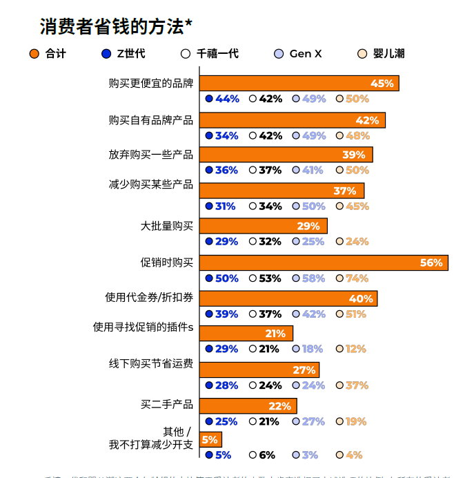 虽然专家和政府机构尚未对美国经济定位衰退,但消费者的感知却相当明显。84%的消费者表示,通货膨胀影响了他们的日常开支,此比例在上季度为77%。不同年龄的消费者都在选择购买更便宜的品牌,减少冲动购买,来降低日常支出。