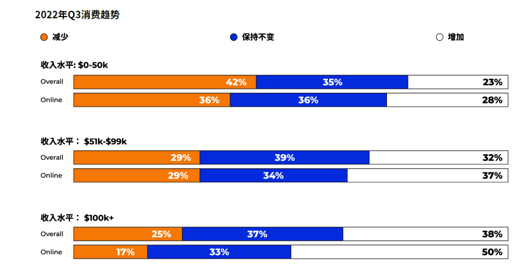 经济衰退对不同家庭收入的消费者影响不同,低收入家庭(年收入低于5万美元)更倾向于大幅降低支出,此比例比高收入家庭(高于10万美元)高出17个百分点。