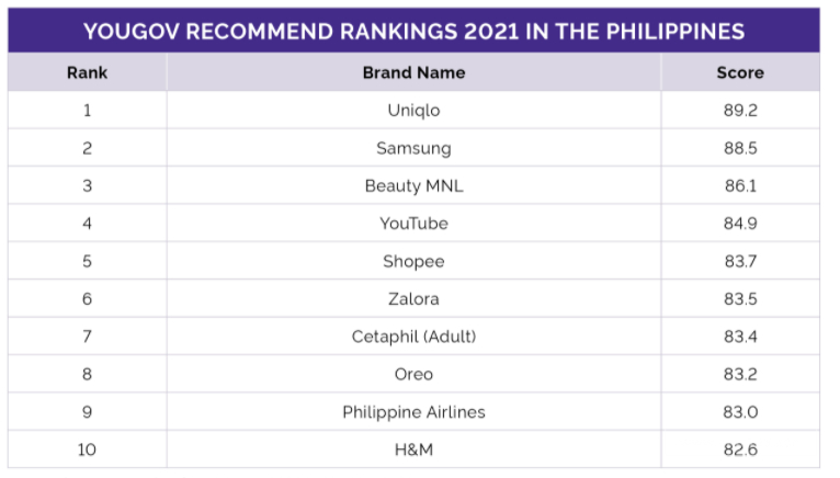 YouGov还发布了菲律宾2021年最受推荐品牌排行榜,优衣库以89.2的分数排名第一。三星排在第二。Beauty MNL排名第三,YouTube排在第四。
