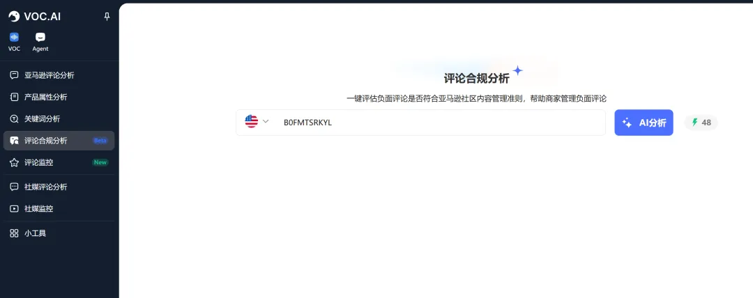 首先,你要进入Shulex VOC官网并登录账号,在侧边栏找到那个【评论合规分析】入口。进去之后,把你的ASIN输进去,点击【AI 分析】。