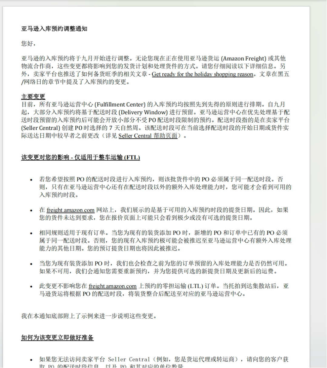 亚马逊的入库预约将于九月开始进行调整。目前,所有亚马逊运营中心 (Fulfillment Center) 的入库预约均按照先到先得的原则进行排期。自九月起,大部分入库预约将基于配送时段 (Delivery Window) 进行预留。亚马逊运营中心在优先处理基于配送时段预留的入库预约后可能会开放小部分不受 PO 配送时段限制的预约。