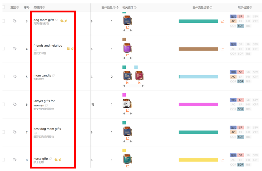 举个例子: 一个香薰蜡烛链接。核心大词是“gift”,但不同的子体(比如狗妈礼物款、闺蜜礼物款、女士礼物款)分别吃下了“dog mom gift”、“friendship gift”、“gifts for her”这些更细分的流量。
