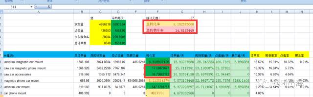 我把三个月销量明细表里面的点击,订单等数据全整理出来,通过上面那张表每个关键词的转化率购物车率,点击率等数据都可以很直观的看出来。