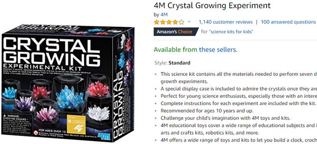 该产品适用于所有年龄段的科学爱好者。其所有材料允许使用者进行7次不同的晶体成长实验,它也提供了完整的实验说明。在“种植”完毕之后,这些水晶将可以无限期存在。此外,它还提供了水晶的展示盒。