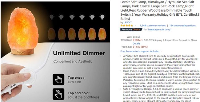 这款产品是由产自巴基斯坦的高品质喜玛拉雅岩盐制成,它有一个安全的触控调光按钮,可用于调整亮度从而制造房间内的氛围。此外,它的魔力在于当开灯时间长到足以加热盐晶体时,盐晶体会释放负离子来对抗电磁辐射,净化空气,从而让使用者的睡眠更加舒适,并让其在醒来时精神焕发。产品底部装有一个优质橡胶和木质底座,经久耐用且具有抗裂性能,因此可以确保灯的寿命。