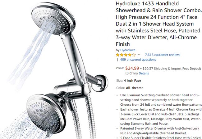 该产品提供了两个4英寸大小的淋浴头,允许使用者一起或单独使用。它的亮点在于可以提供24种不同组合配置的淋浴体验,如顶喷式、按摩式或喷雾式等。此外它还配有一根5英尺长的不锈钢软管。
