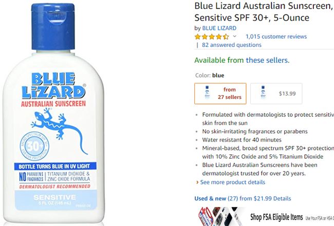 该产品由天然氧化锌和二氧化钛精制而成,敏感肌肤人群也能放心使用。它不含对羟基本甲酸酯、化学成分和香料,能够有效抵抗UVA和UVB。其外包装瓶在有害光线下会变成蓝色,可以提醒使用者什么时候需要使用它。瓶身颜色越蓝,使用者就越需要它。