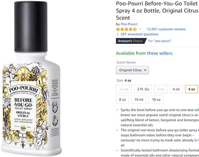 该产品由精油和其他天然化合物制成,完全不含化学成分,它所采用的是经过科学检验的浴室除臭配方,不含任何刺激性化学物质、气溶胶、对羟基本甲酸酯、邻苯二甲酸盐或甲醛。使用者只需要在如厕之后喷上一些,就可以消除难闻的气味。其原版香味配方采用了柠檬、佛手柑和柠檬草。