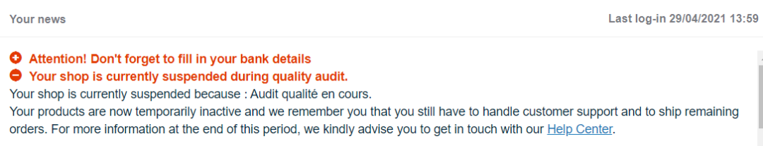 您在过去24小时内错误地"中止"了您的商店活动,请在帮助中心中开case,主题为:“取消错误(Erreur de résiliation)”