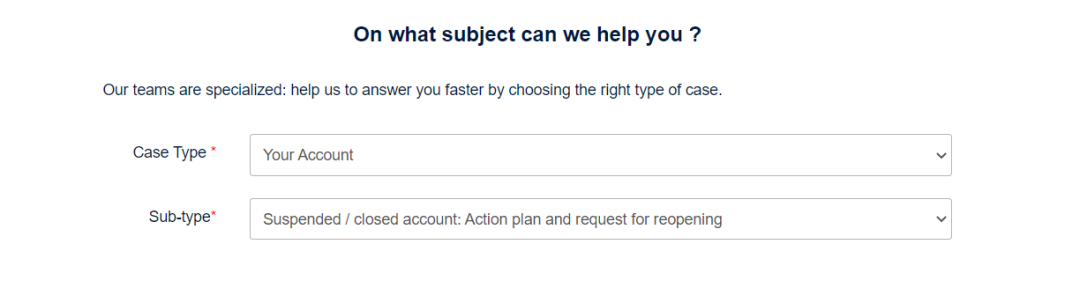 您只需创建一个新的case:“您的帐户”>“已暂停/关闭的帐户-重新打开请求”,选择说明原因,然后在“描述”字段中提供行动计划。