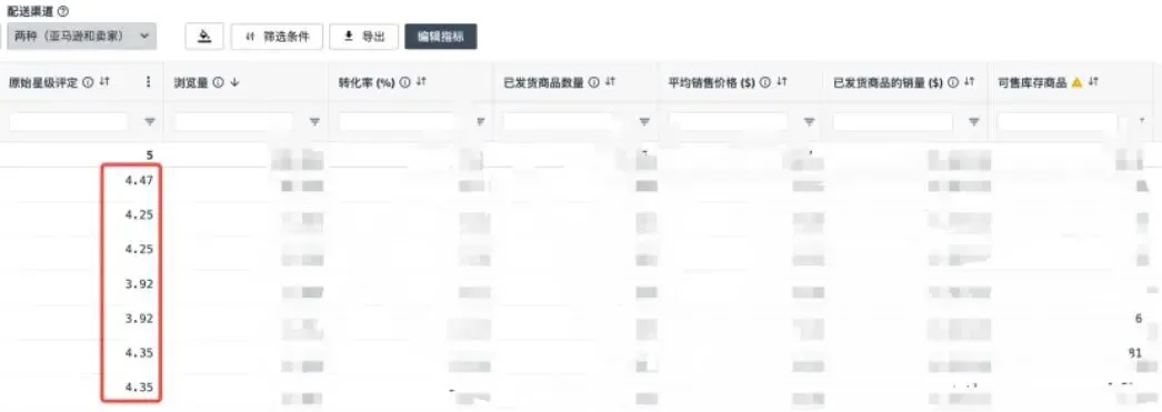 若表格中未显示「原始星级评定」列,点击页面右上角「编辑指标」。在添加指标页面勾选该选项并保存,就能看到商品完整小数位的原始评分。
