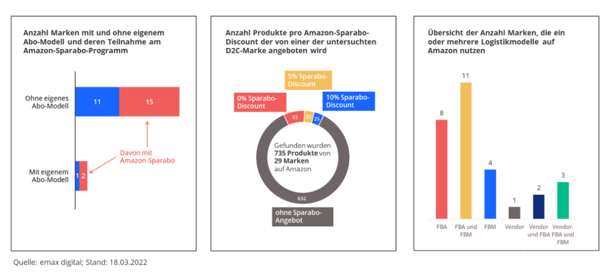 Emax Digital数据显示,在57个化妆品DTC品牌中,有28个没有在亚马逊上销售。在其余29个品牌中,17个提供Spar-Abo订阅。且自有商店中没有订阅功能的品牌在亚马逊上的比例明显高于商店中没有订阅功能的品牌比例。这表明相当多的DTC品牌会选择先在亚马逊上“试水”,测试其客户的订阅接受度,然后在他们自己的在线商店中推出类似服务。